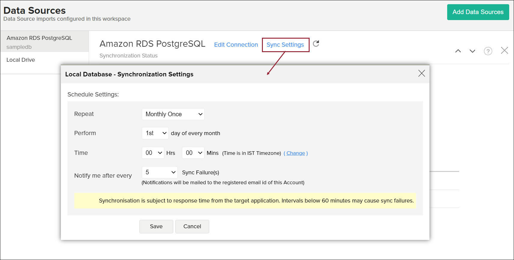 Click Save. The data from your Amazon RDS PostgreSQL database will be imported into Analytics Plus in the specified intervals.