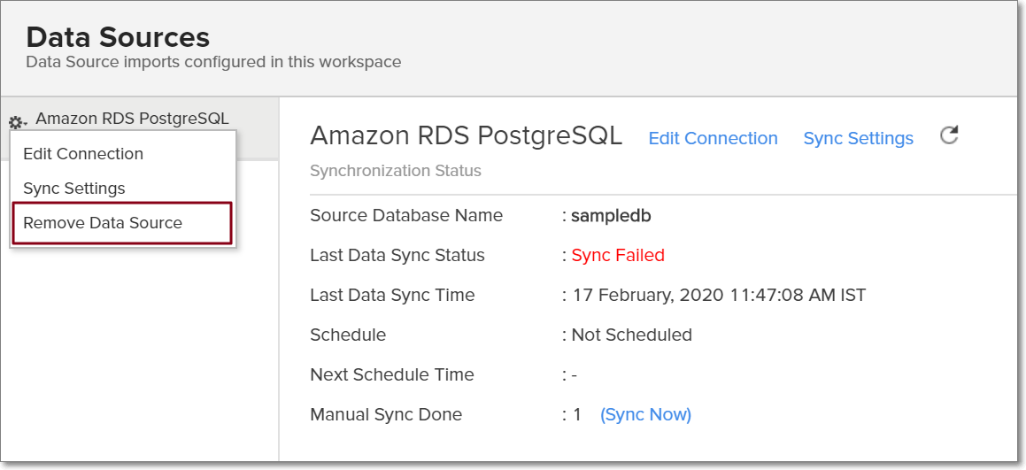 Note: Removing the data source does not delete the corresponding tables and reports from Analytics Plus. However, further synchronization cannot be carried out.