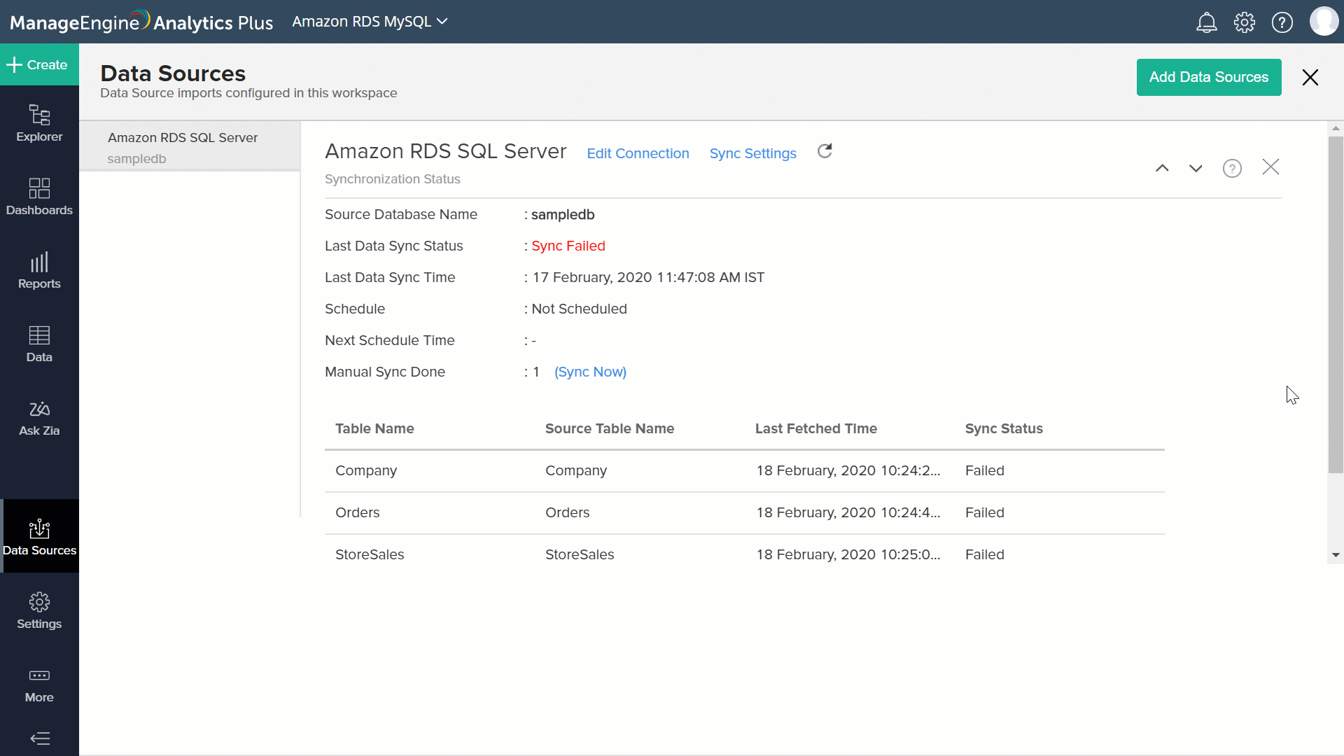 The data from the Amazon RDS SQL Server database will be imported and stored in Analytics Plus.The data from the Amazon RDS SQL Server database will be fetched live using appropriate reporting queries, whenever you create or access a report in Analytics Plus.