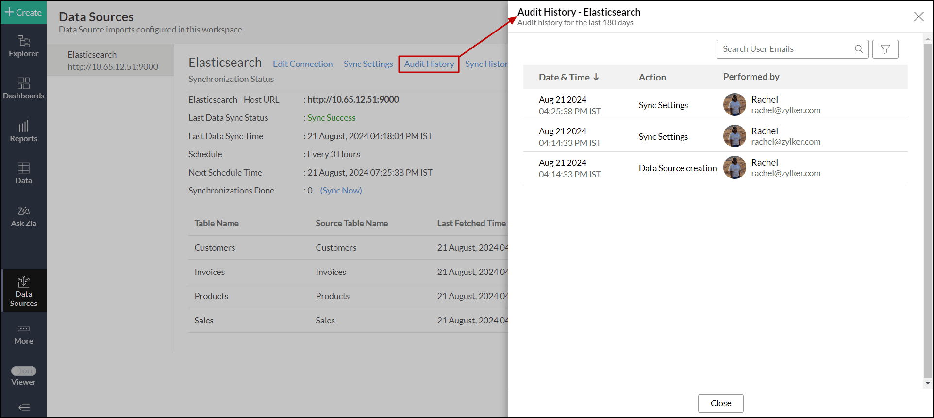 Analytics Plus provides a detailed record of all actions performed with respect to data synchronization from various sources. The history captures the type of action performed along with the timestamp and information about the administrator who performed it.