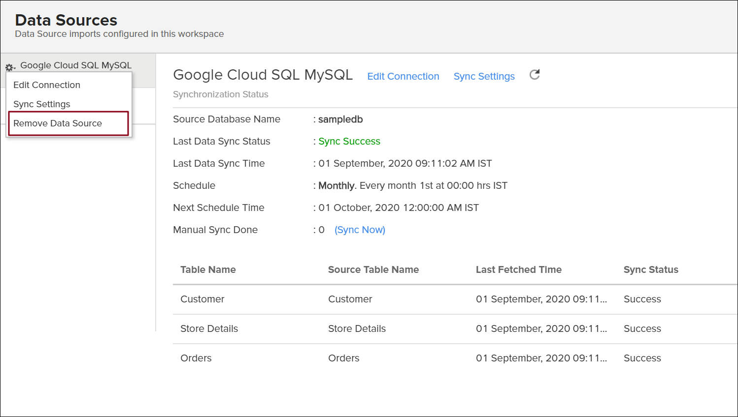 Note: Removing the data source does not delete the corresponding tables and reports from Analytics Plus. However, further synchronization cannot be carried out.