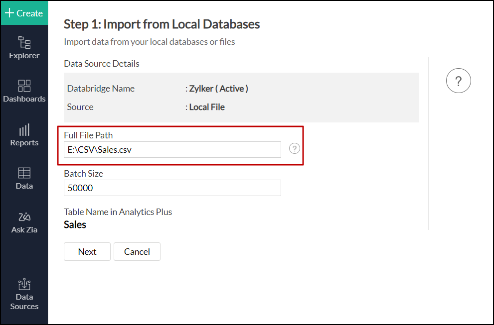 Analytics Plus lets you import your data stored in large CSV files (greater than 100 MB or 100,000 rows) easily using ManageEngine Databridge. It is a lightweight independent utility that bridges the gap between your local machine and Analytics Plus for hassle-free data import. You can also automate the import process to synchronize the data into Analytics Plus at periodic intervals. Click here to learn more about ManageEngine Databridge.