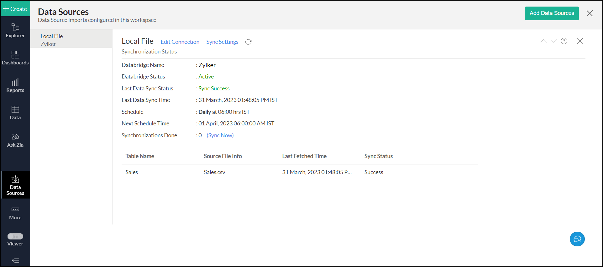 After setting up the data import from your local file, you might have to wait sometime for the initial fetch to happen. Depending on the amount of data in the local file, Analytics Plus takes a few minutes to display the data. If you access the workspace before the initial fetch is complete, it will not display any data.