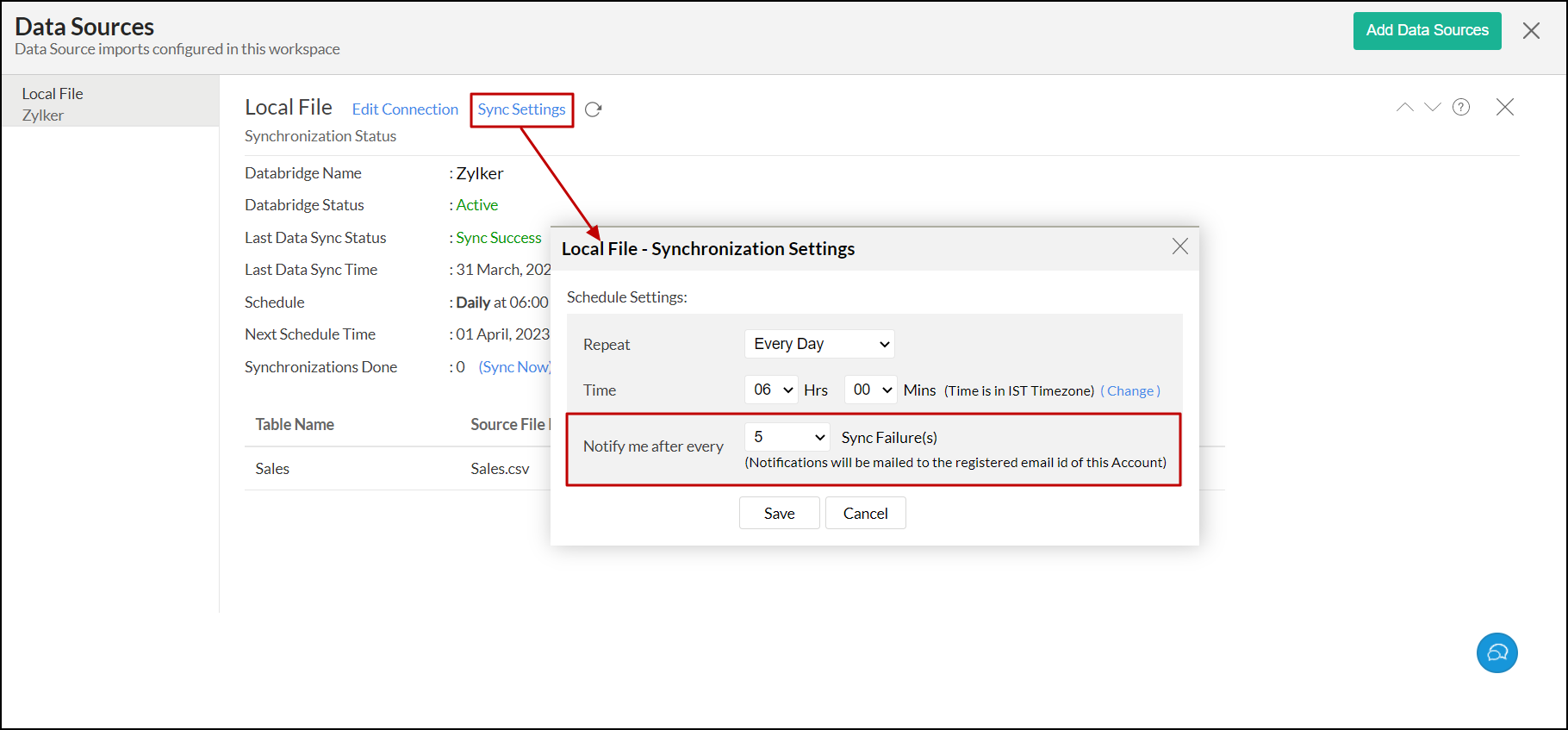 - Specify the number of consecutive import failures after which you should be notified using the Notify me after every 'N' Sync Failure (s) section.