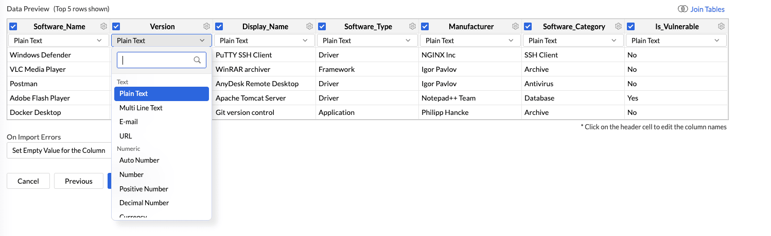 To change the data type, click the drop-down icon of the column and select the data type from the list.