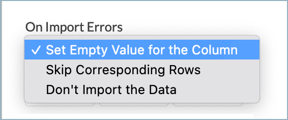 Set Empty Value for the Column (default) - Select this option to set empty value to the corresponding column value which had problems while importing.