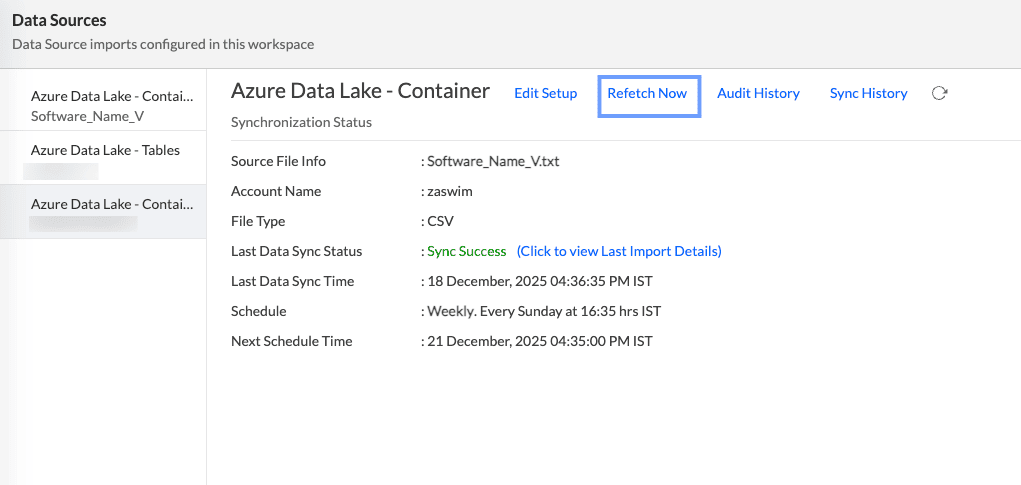 After setup, you might have to wait sometime for the initial fetch to happen. This depends upon the amount of data imported into Analytics Plus and also the response time of your Azure Data Lake server. You will receive an email notification once the import is complete. Please note that, if you access the workspace before the initial fetch, it will not display any data.