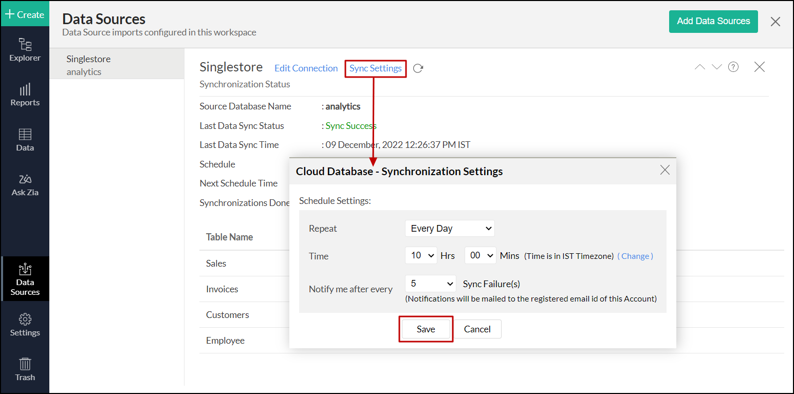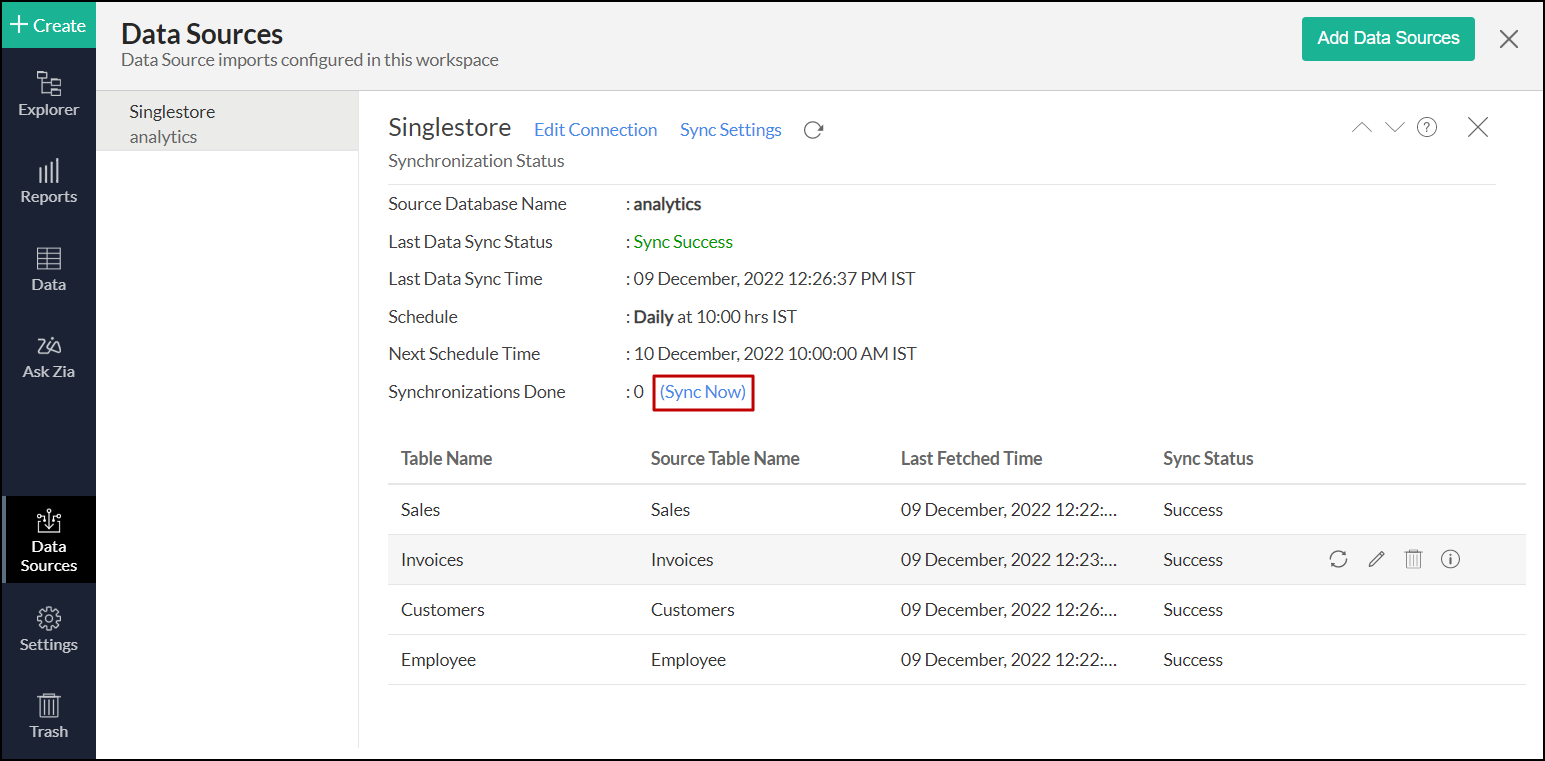 - Navigate to the required Singlestore data source and click the Sync Now link.
