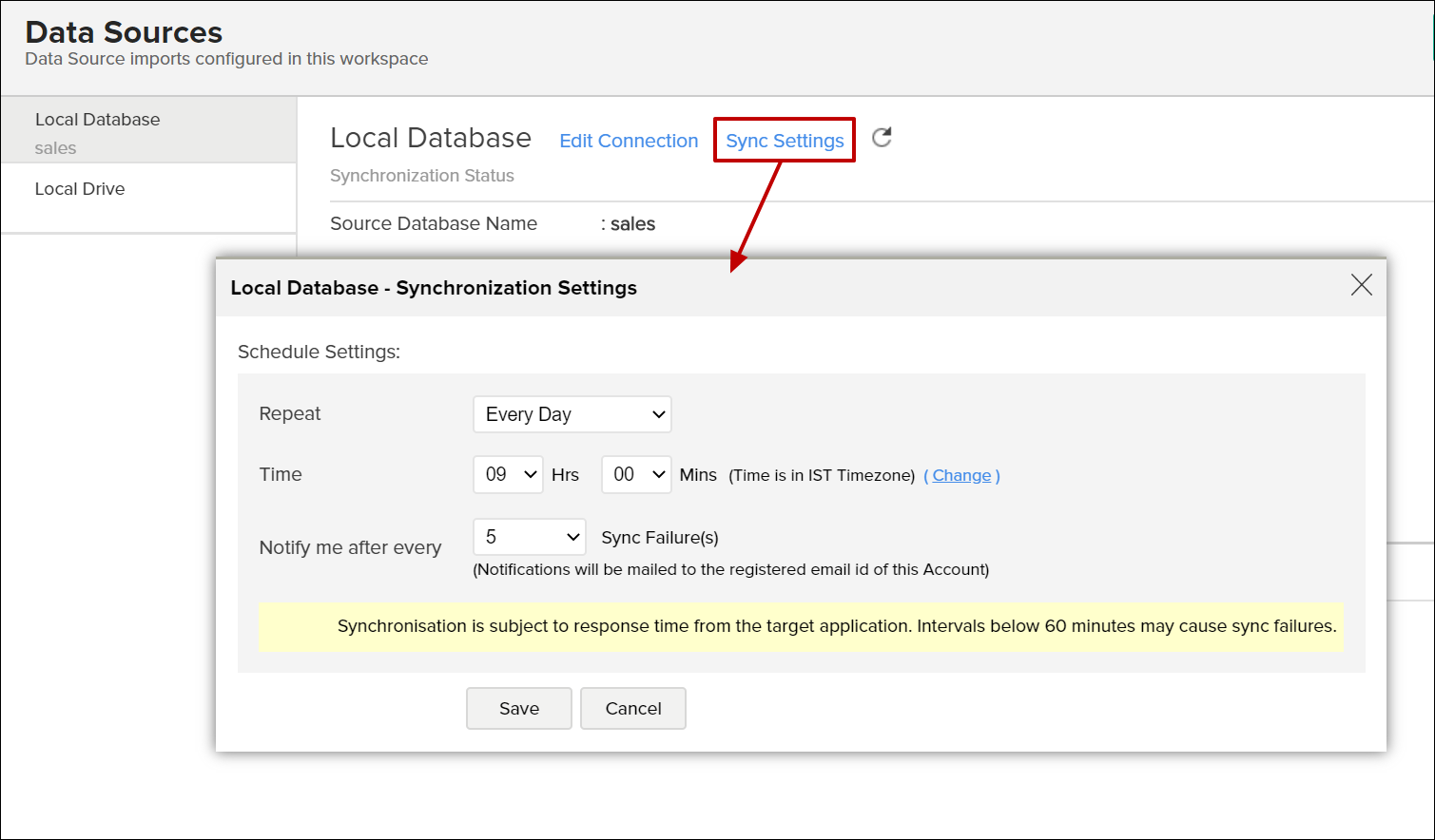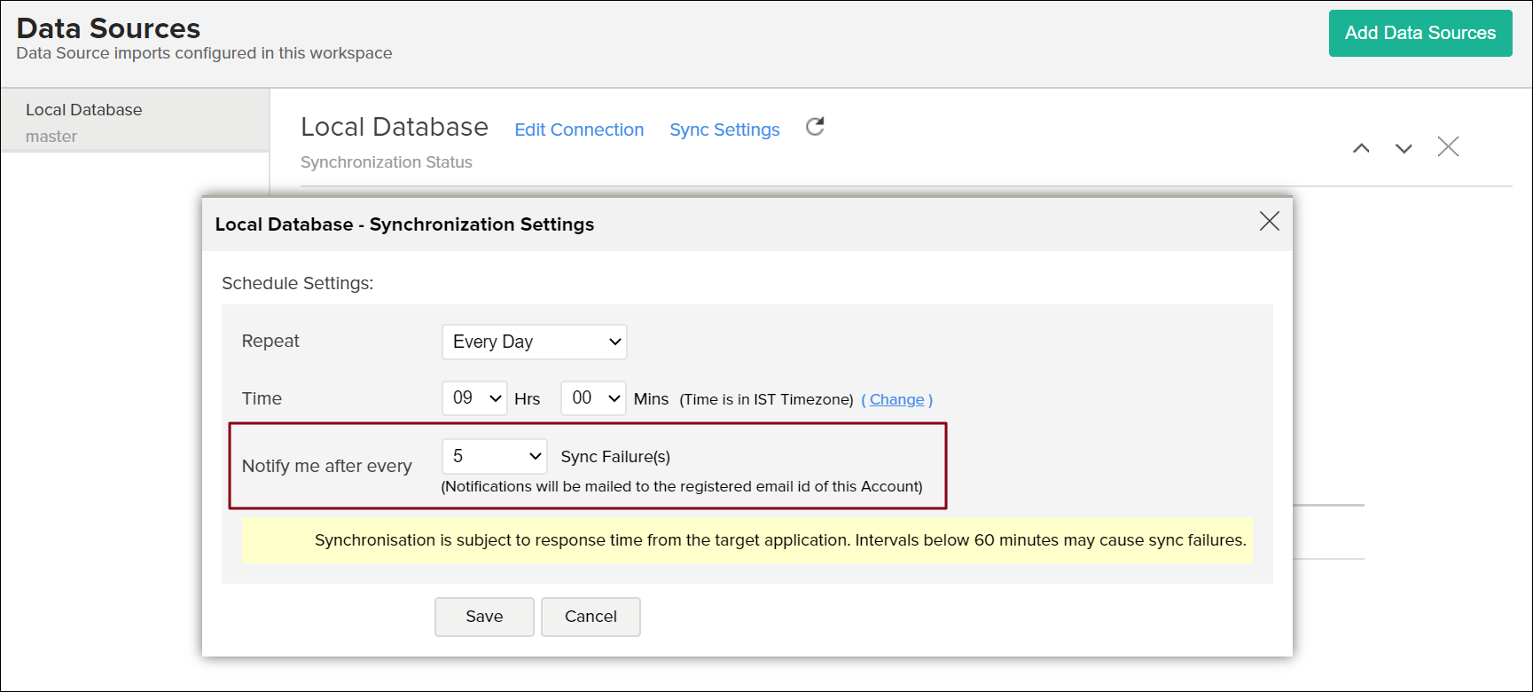 • Specify the number of consecutive import failure after which you are to be notified using the Notify me after every 'N' Sync Failure (s) section.
