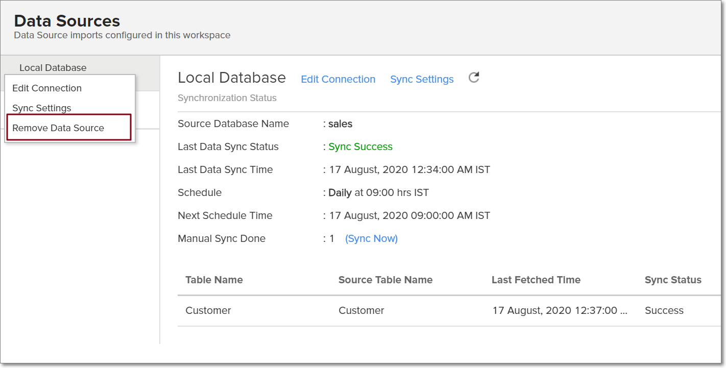• Click the Settings icon that appears on mouse over the data source's name, and select Remove Data Source