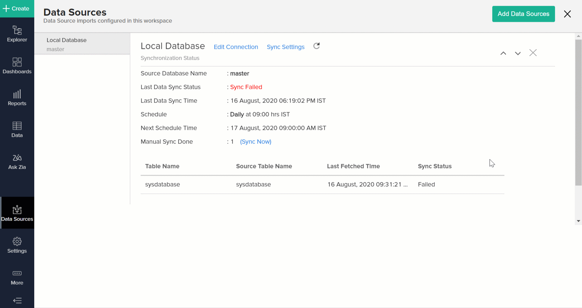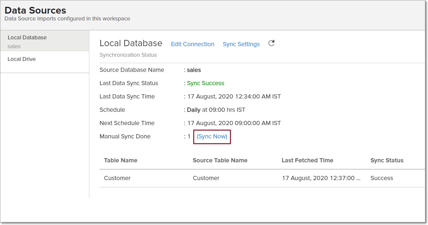 After setting up data import from your local database, you might have to wait some time for the initial fetch to happen. Depending on the amount of data in your application, the reports and dashboards might take up to 5 minutes to display all the metrics. If you access the workspace before the initial fetch is complete, it will not display any data.