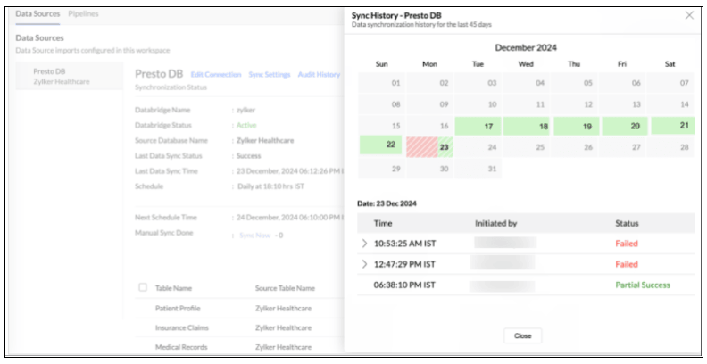 Provides a detailed record of data synchronization activities, making it easy for the administrators to track the status of each data sync. The sync operations are color-coded for easy recognition. Successful data syncs are indicated in green, signaling that the data sync is completed without any issues. Failed data syncs are marked in red with the reasons for failure along with the necessary action to be taken.