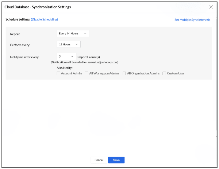 Helps manage and modify the frequency of data synchronization (e.g., change from daily to hourly syncs) based on the current needs of your analysis. In case of a sync failure, you can specify which users should be notified. You can manage the periodic fetch settings for the tables where only the newly added records are imported. Refer to the Schedule Import section to learn more.