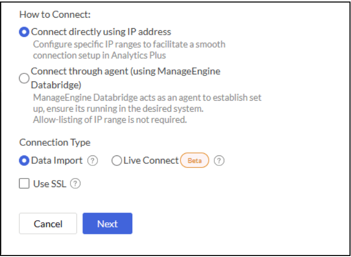 - Connect directly using IP addresses: You must allow-list Analytics Plus IP addresses to use this method.