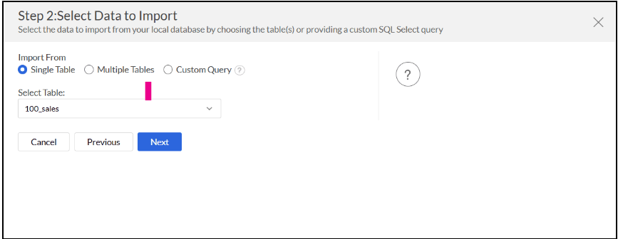 Once the connection details are configured, you need to decide which data you want to import from Presto. Analytics Plus offers a range of import options, including Single Table, Multiple Table, and Custom Query, to support various data structures and analysis needs.