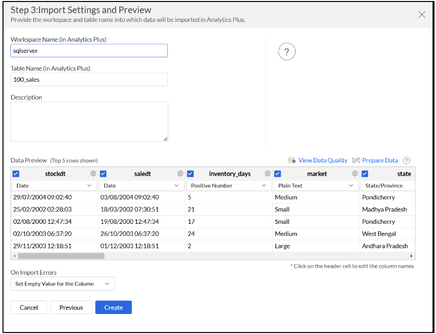 To import data into an existing workspace, Click the Create icon on the side navigation panel and choose New Table/Import Data from the drop-down menu. Successive steps are similar to the steps mentioned in this section.