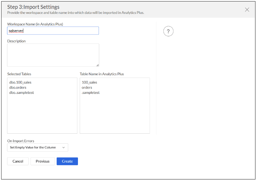 4. On the Import Settings page, enter the Workspace Name to be created in Analytics Plus. Additionally, you can add a Description for the workspace.