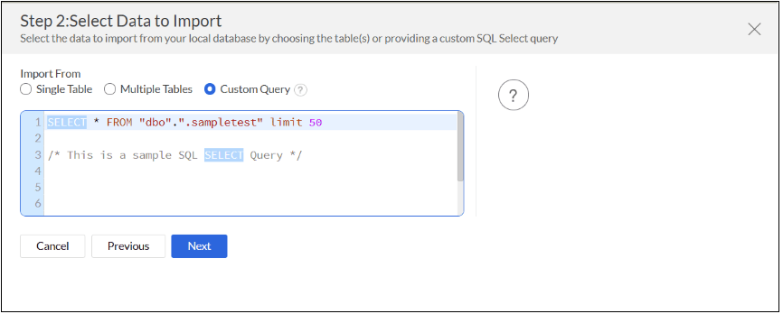 Select the Custom Query option and provide the SQL SELECT query in the given text area.