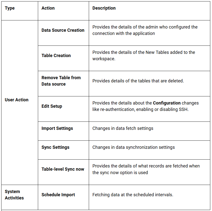 The following are the User Actions and the System Actions that are logged in Analytics Plus: