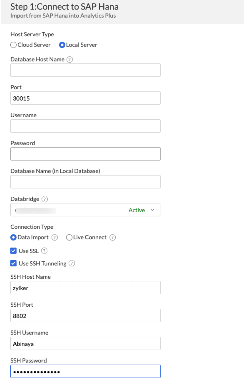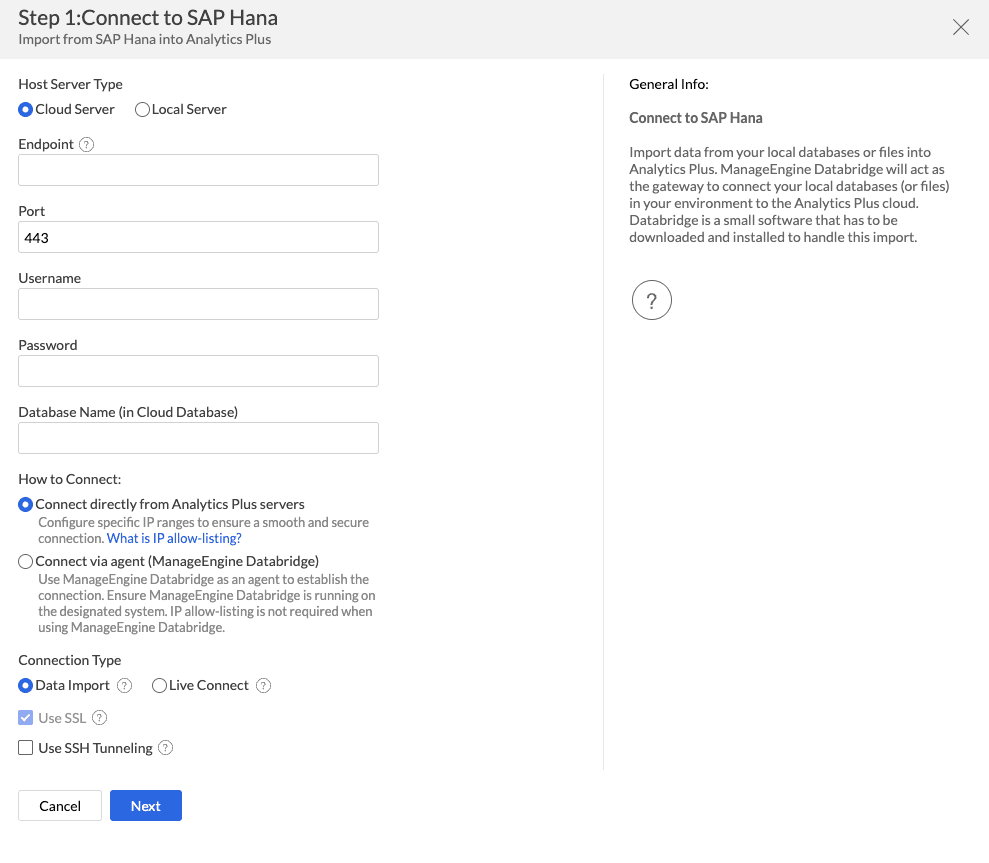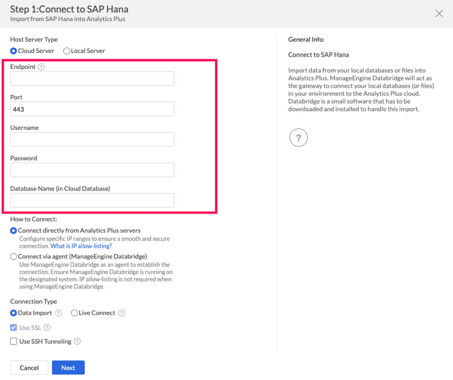 Connect through agent: Databridge is an utility tool that helps fetch the data hosted in private networks. Ensure to have the latest version of Analytics Plus Databridge.