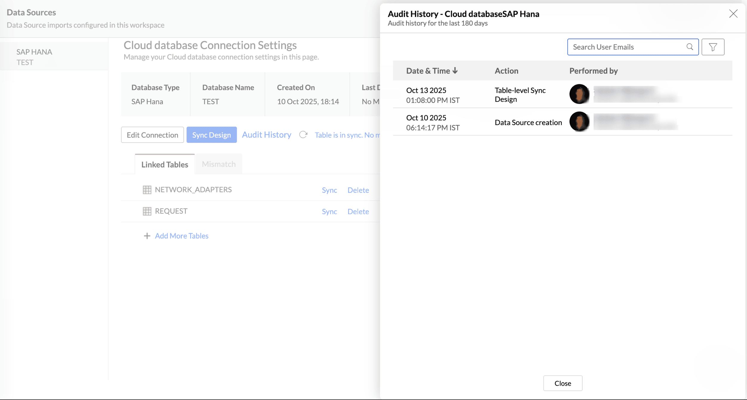 Audit History: Track user and system actions with detailed audit logs for each data source.