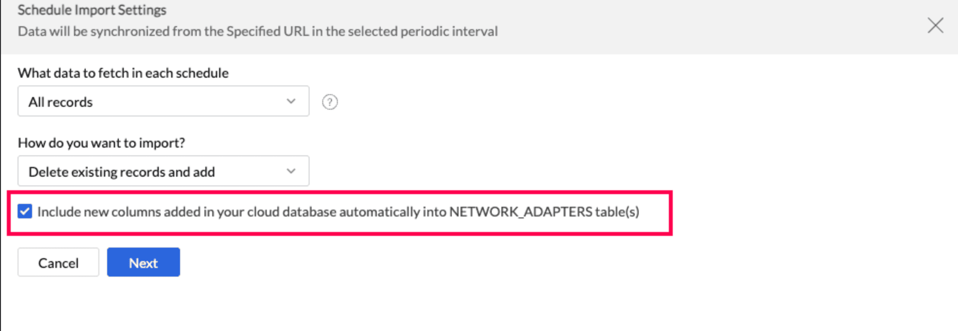 Select Include new columns added in your cloud database automatically into Analytics Plus table(s) to import data from newly created columns in the subsequent imports.
