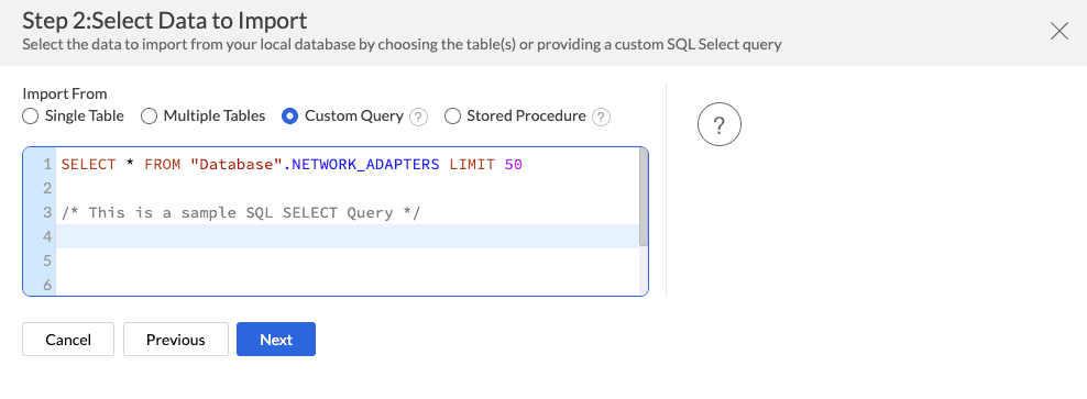 Select the Custom Query option and provide the SQL SELECT query in the given text area.