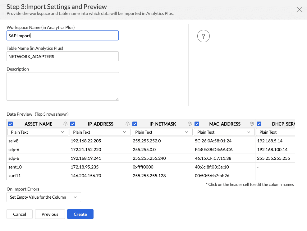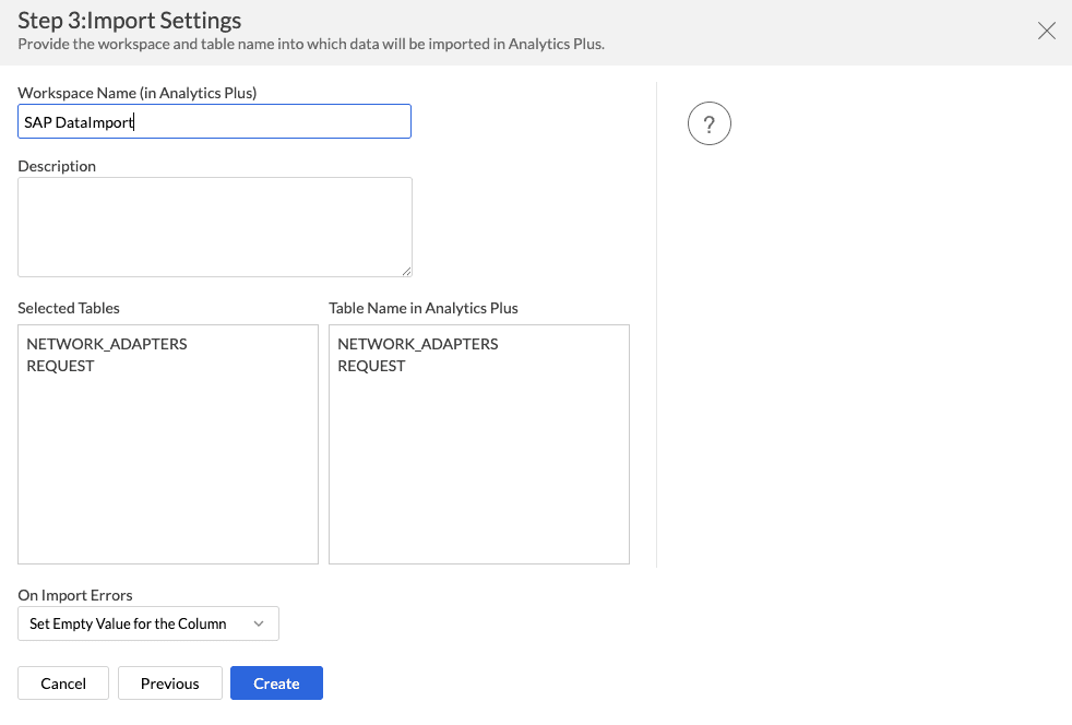 In the Import Settings page that opens, specify the Workspace Name that is to be created in Analytics Plus. You can also provide a Description about the workspace.
