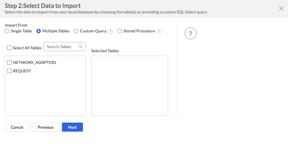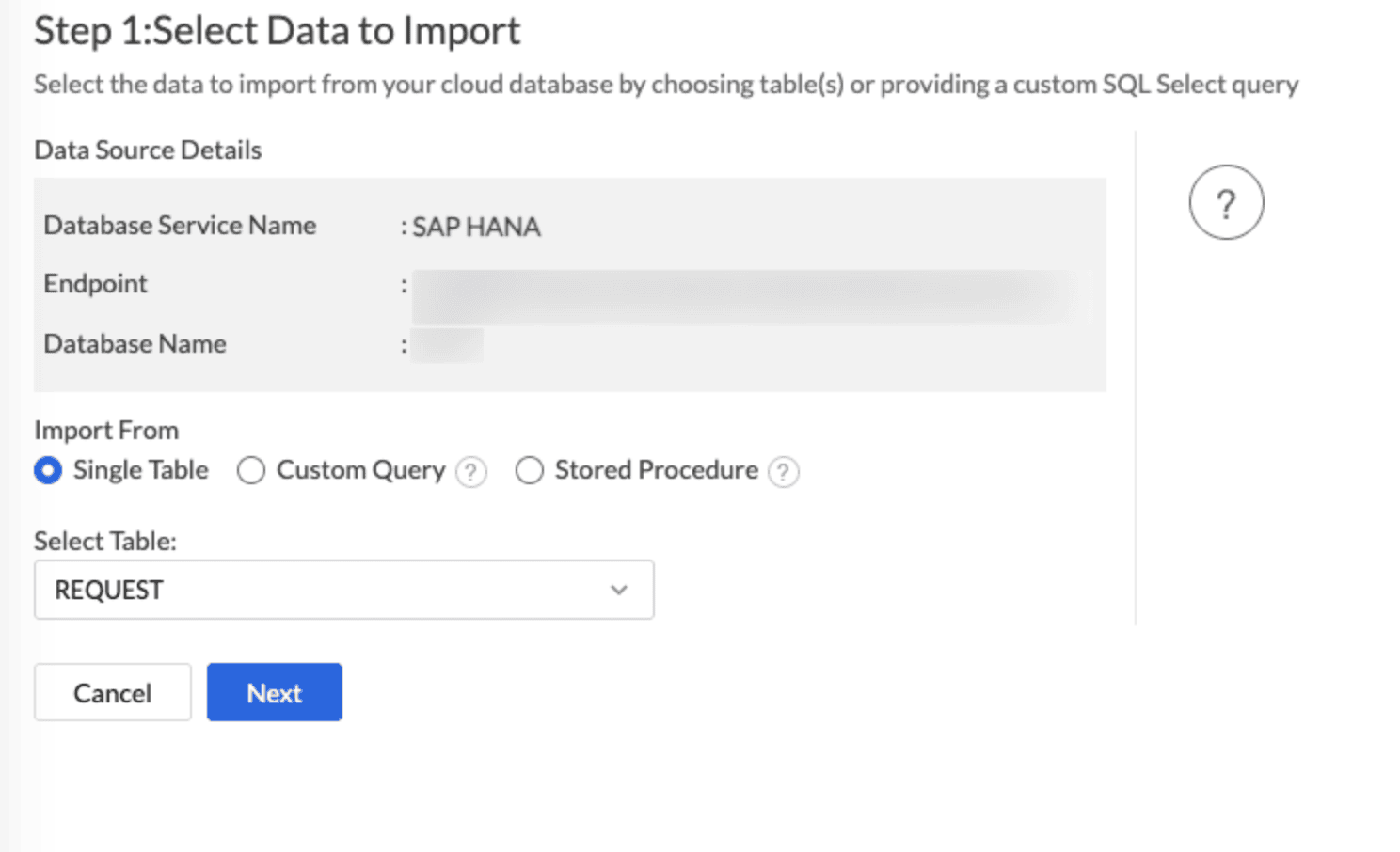 Once the connection details are configured, you need to decide which data you want to import from SAP HANA. Analytics Plus offers a range of import options, including Single Table, Multiple Tables, and Custom Query to support various data structures and analysis needs.