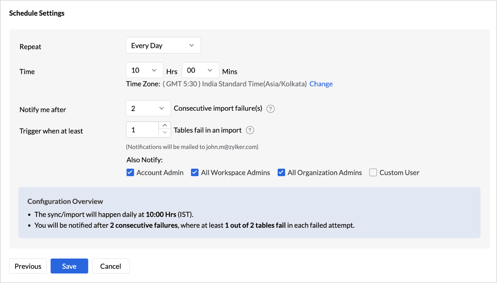 In the case of continuous import errors, you can choose to be notified via email. To get notifications, select the interval at which you need to be notified from the Notify me after every drop-down menu.