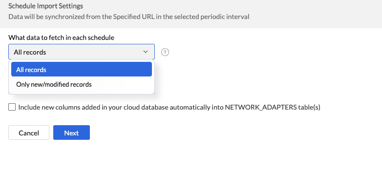 Choose What data to fetch in each schedule drop-down menu. You can choose to import all the records or incrementally fetch only the newly added or modified records.