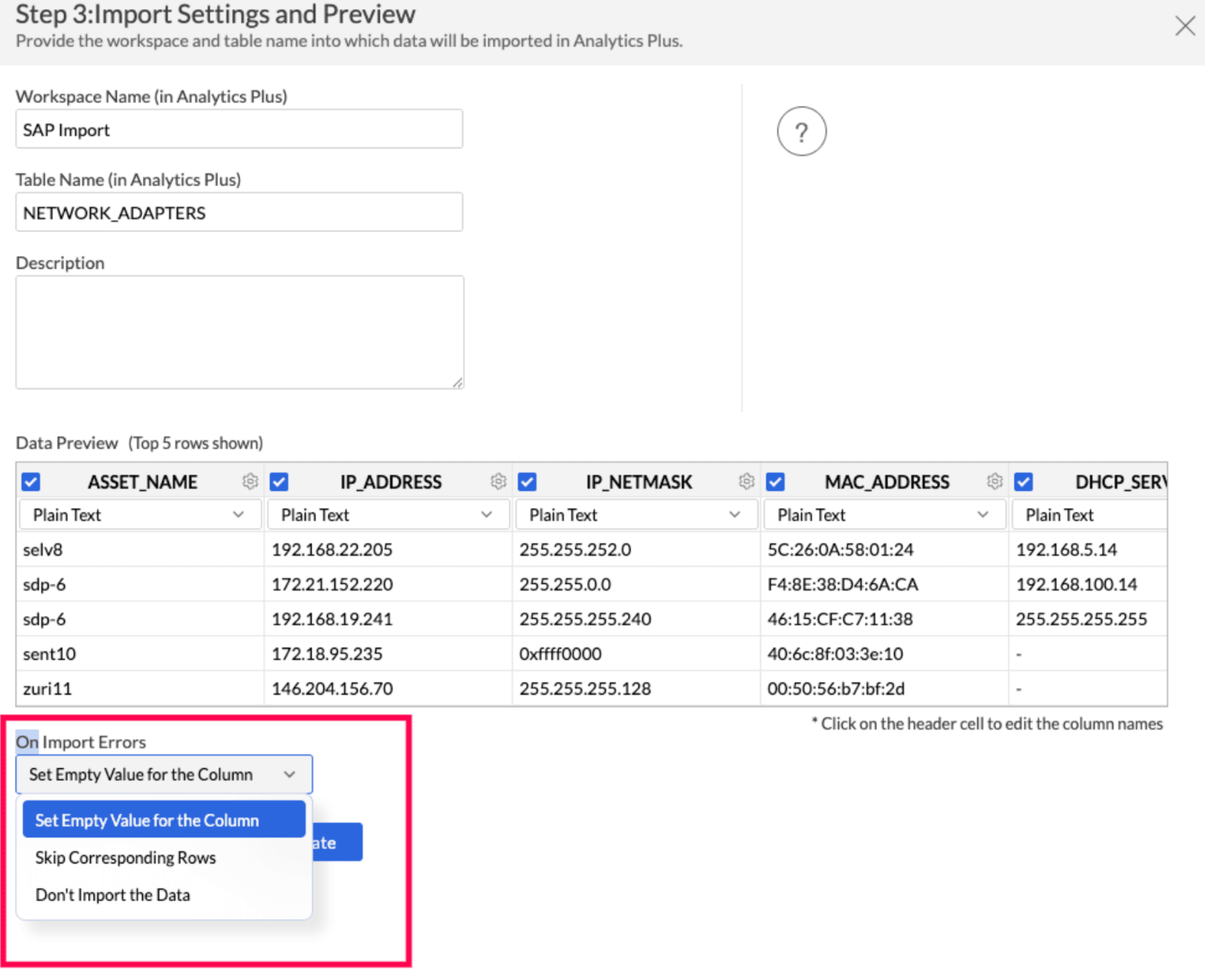 Choose how you want to import the data into the existing table and select how to handle import errors.