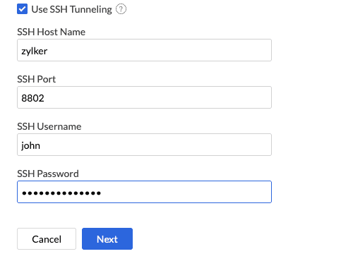 Select the checkbox, Use SSH Tunneling to secure data transmission. Provide the SSH Host Name, SSH Port, SSH Username, and SSH Password.