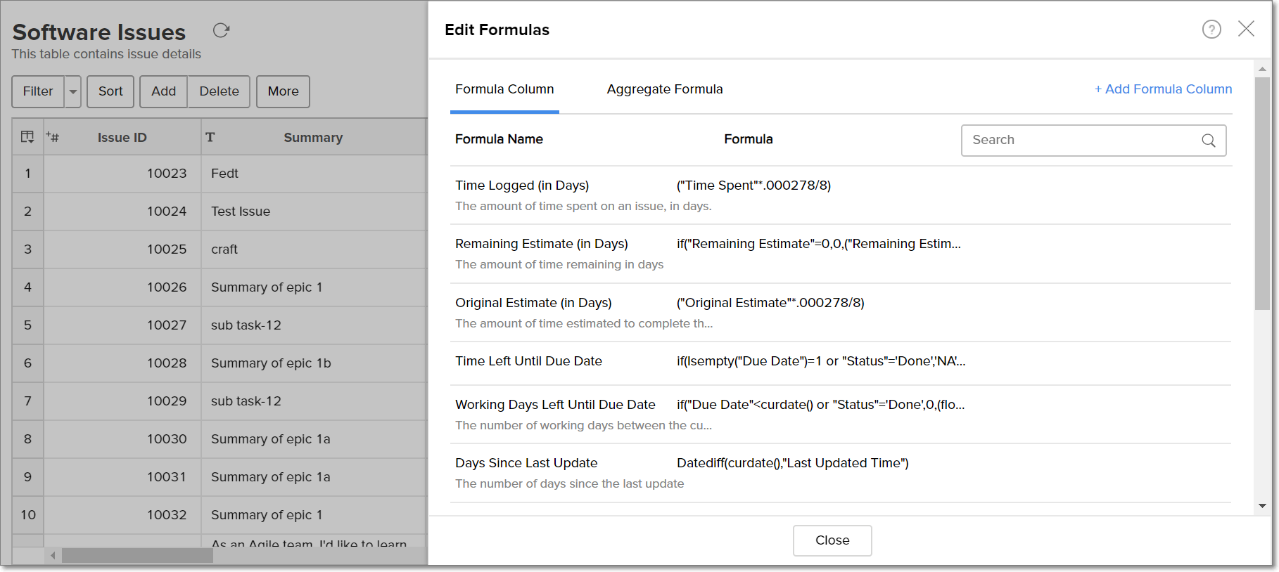 Formulas are calculations that can be defined using the powerful formula engine in Analytics Plus, to create required reports. Refer this documentation to know more. There are also several default formulas created based on the Jira Software modules. To view the default formulas, open the required table, click Add and select the Edit Formulas option.