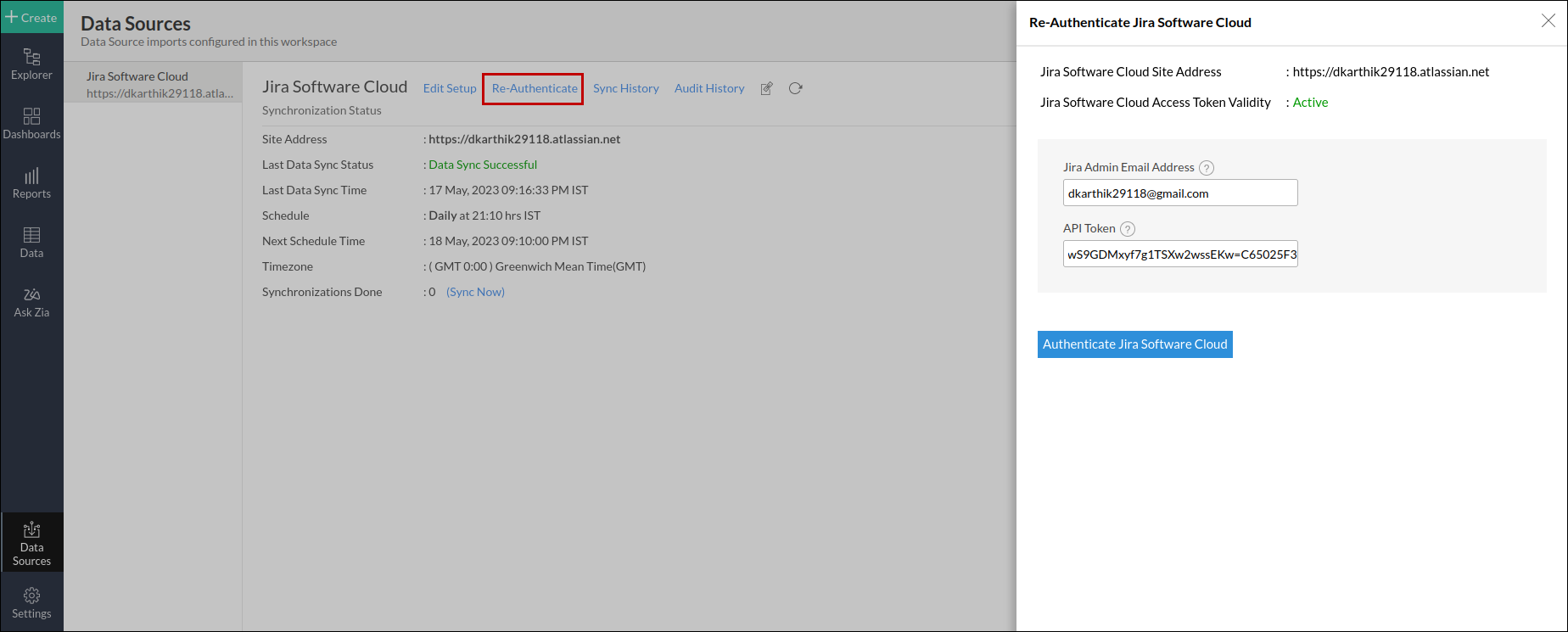 The synchronization of your Jira Software data can sometimes fail, due to several reasons. To resolve this, click the Data Sources option from the side panel and click the Re-Authenticate link.