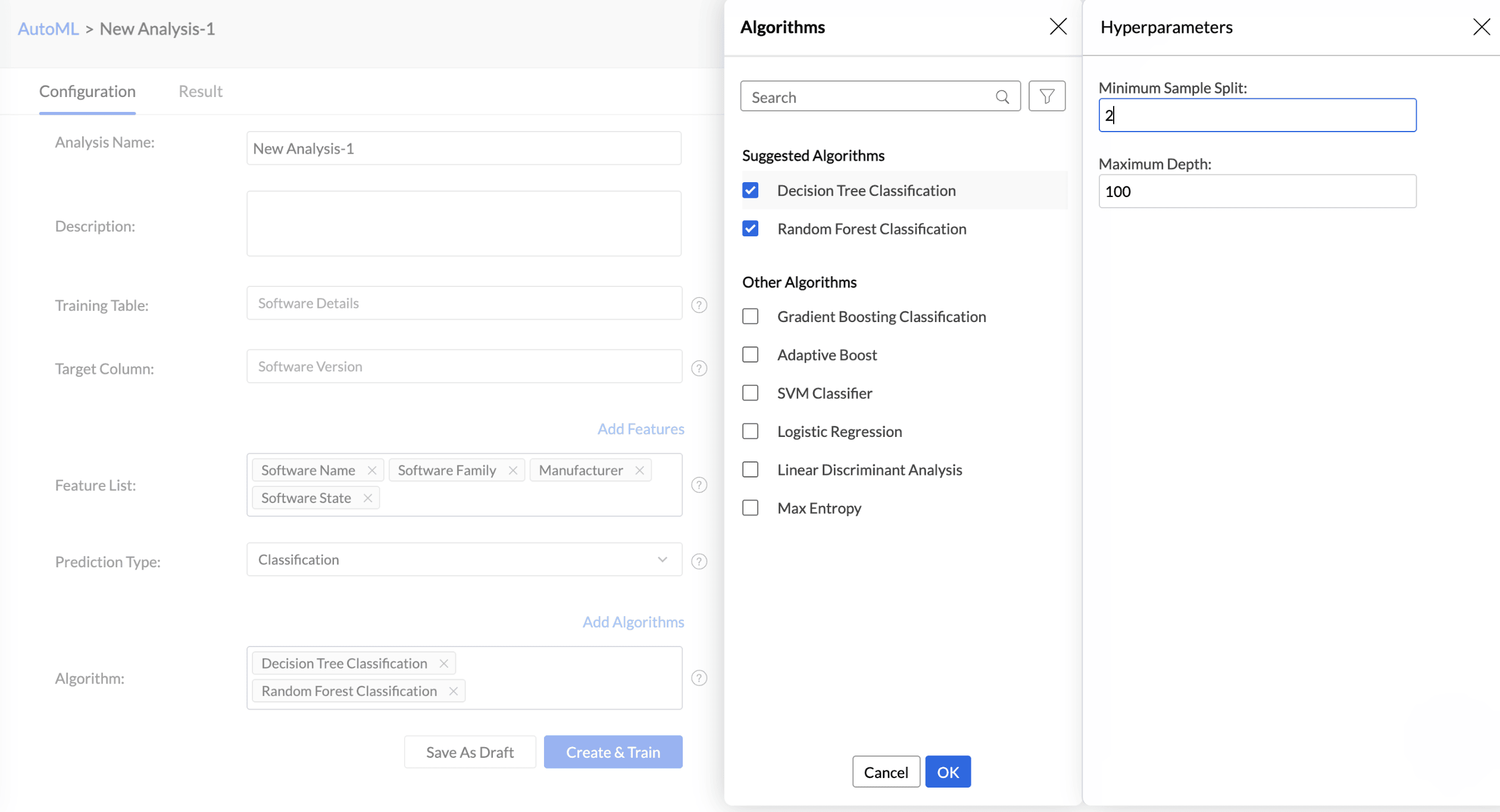 The Save as Draft option lets you preserve the model configuration, including algorithm selection and feature settings, so that you can initiate model training later at your convenience.