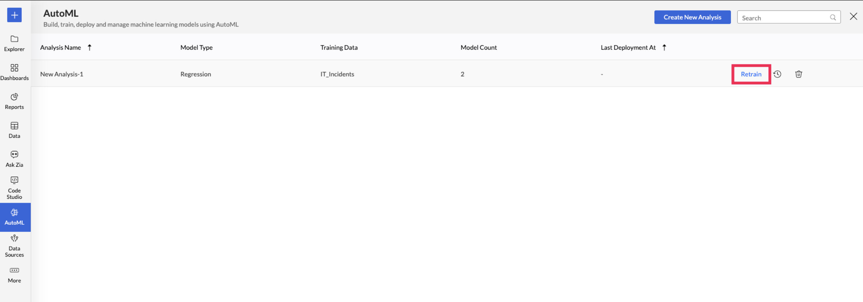 Retraining an Analysis: Access the AutoML tab and hover over the Analysis to be retrained, and click Retrain. This will retrain all the models in the selected analysis.