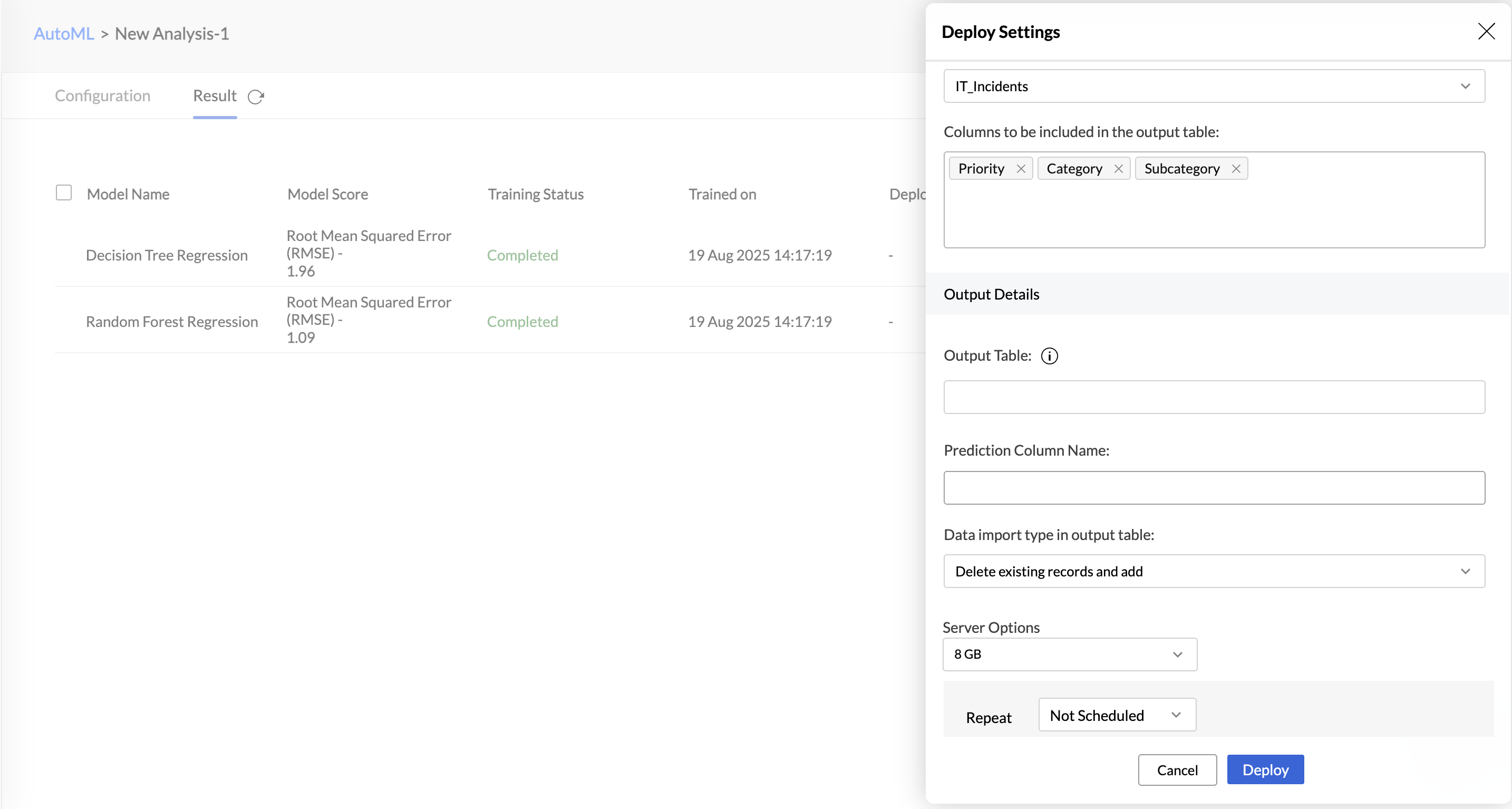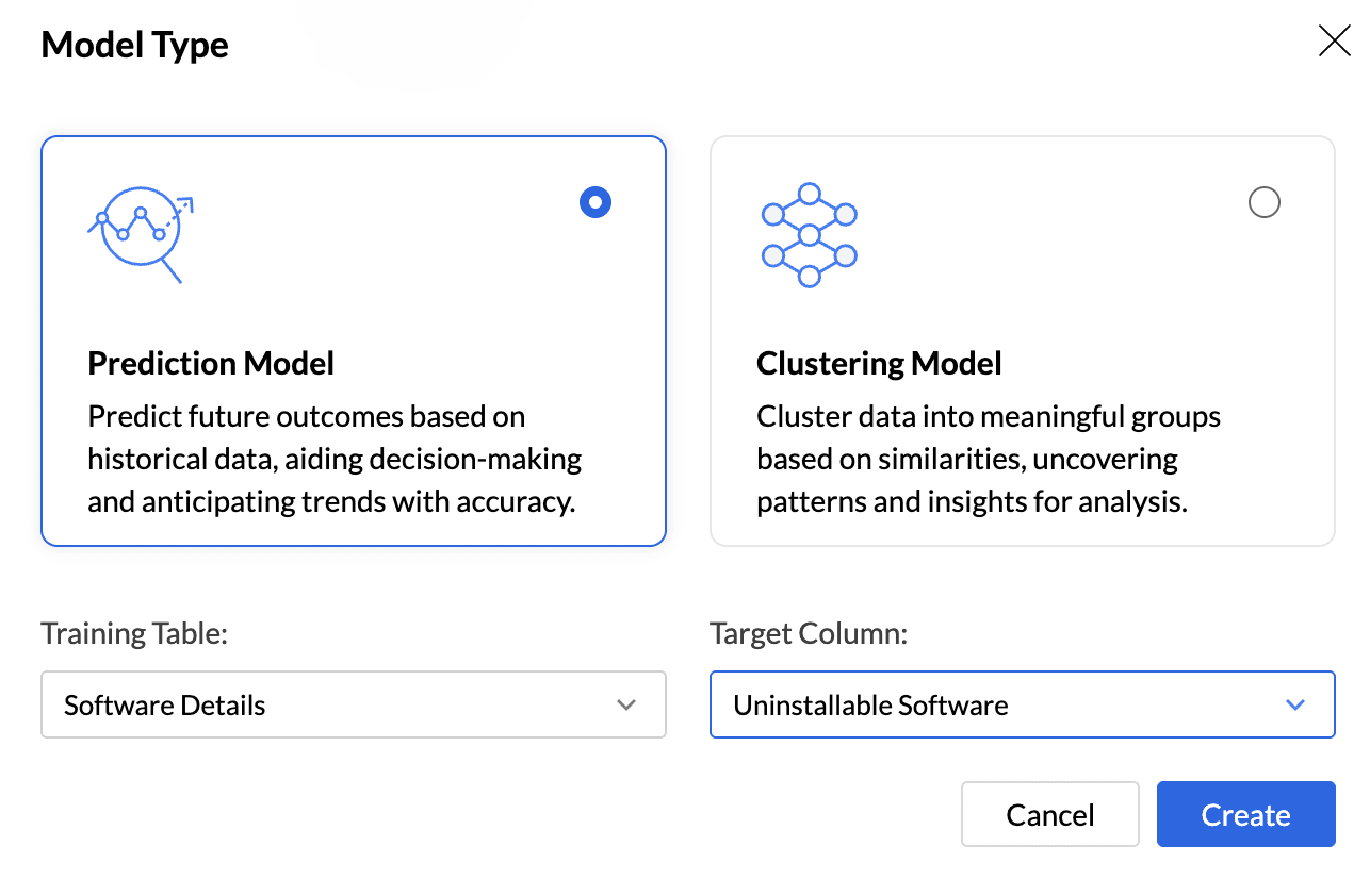 Select the Model Type that should be used for training based on your goal. Analytics Plus supports two models, Prediction and Clustering.