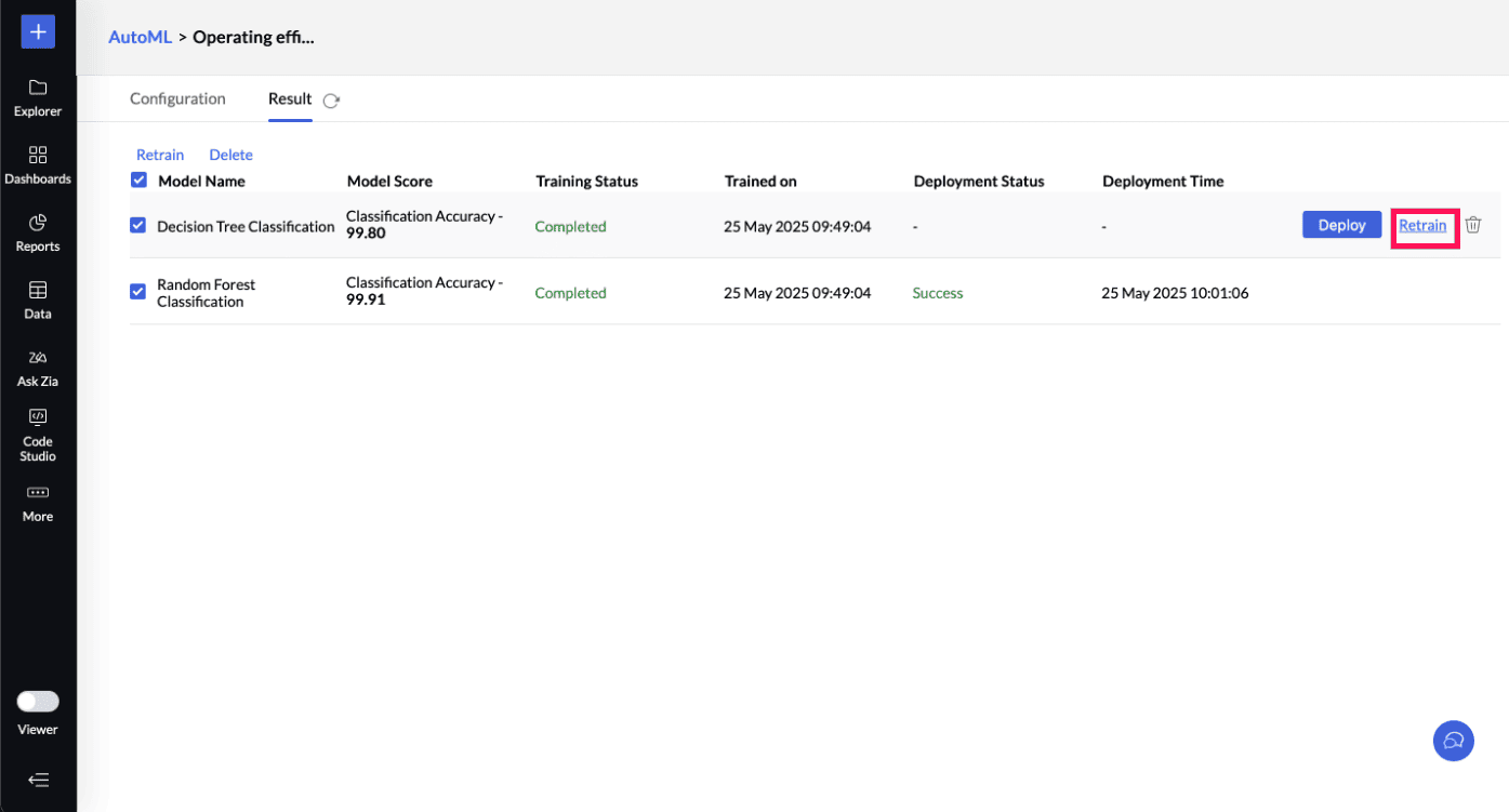 Retraining a specific ML model: Access the AutoML tab and choose the Model you want to retrain. Hover on the model and click Retrain.