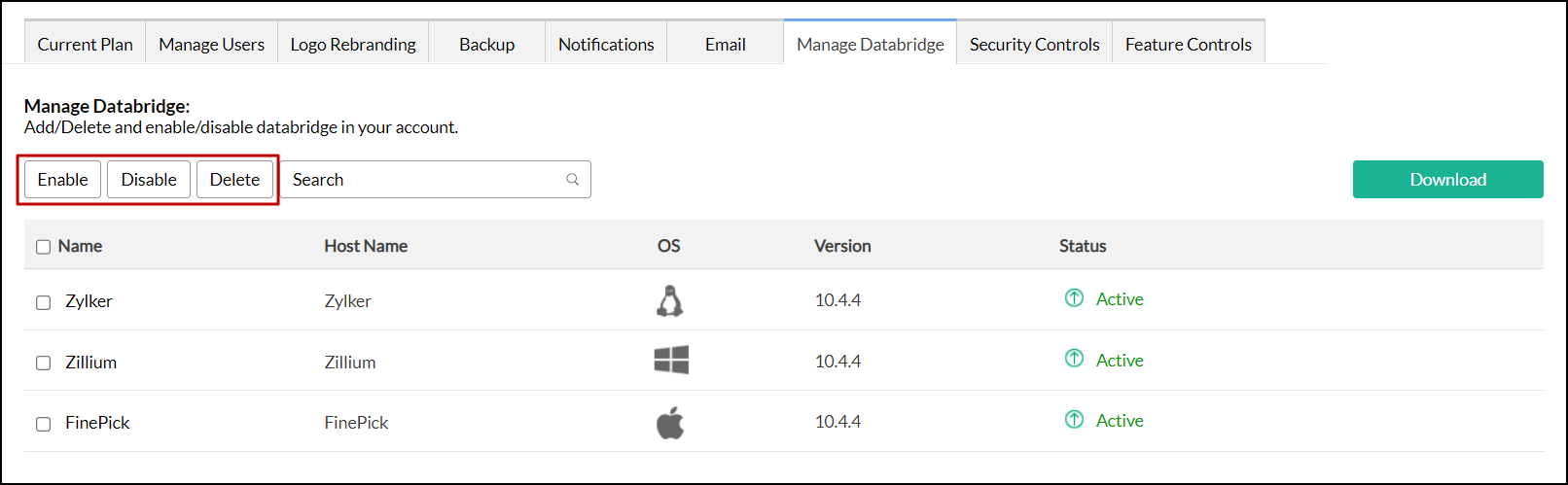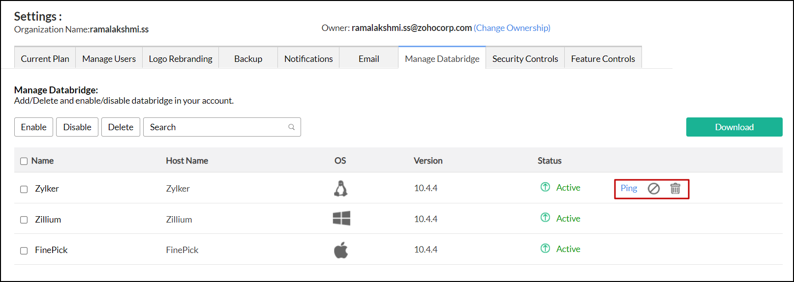 Analytics Plus lists all the ManageEngine Databridge installations linked to your account with the Name, Version, Hostname, OS, and Status information. You can perform the following actions from this page: