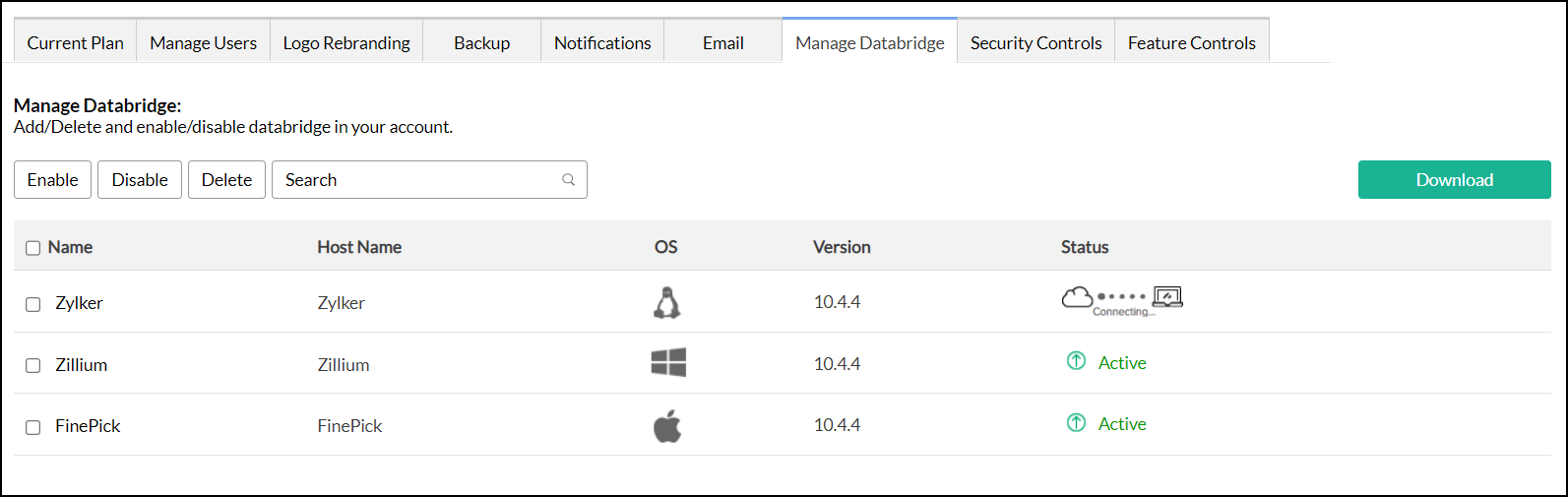 Analytics Plus allows you to manage all the Databridge installations from the Manage Databridge page under Settings.