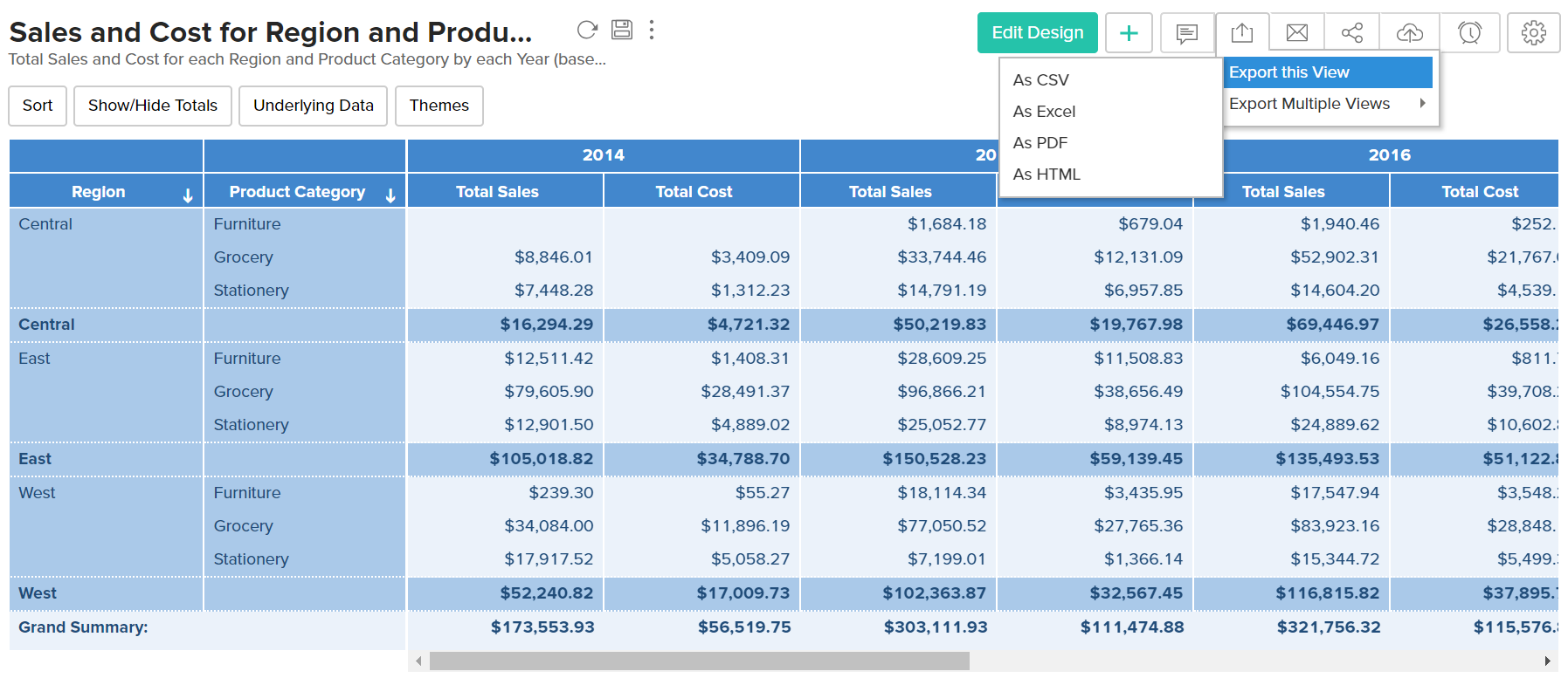 ManageEngine Analytics Plus allows you to export Pivot Table that you have created into various file formats like CSV, PDF, XLS and HTML files.