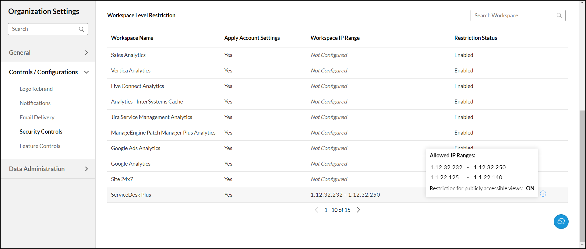 Analytics Plus allows you to enhance security and ensure data confidentiality by specifying a list of IP addresses to regulate access to data and views on Analytics Plus. You can enable IP restriction at both Organization and Workspace levels. To enable IP restriction, follow the steps below.