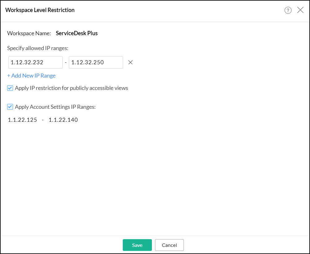 - The Workspace Level Restriction dialog will open with Workspace Name and Specify allowed IP ranges section.