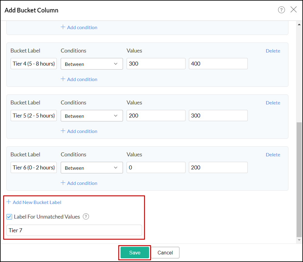 - Selecting the checkbox Labels for Unmatched Values will group all the data points that do not fall under any of the given conditions into a separate bucket. Specify the labels that should be given for that bucket.