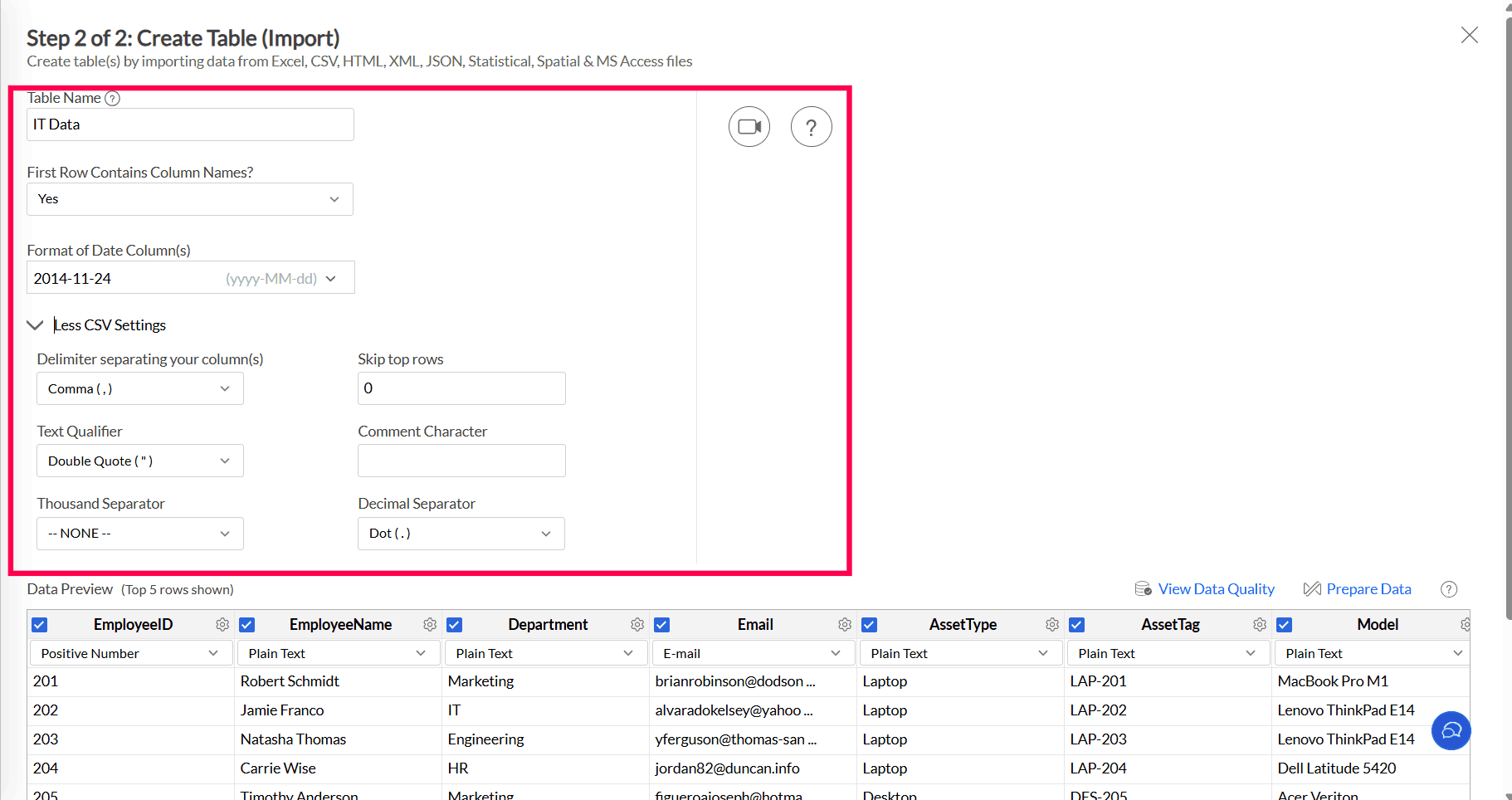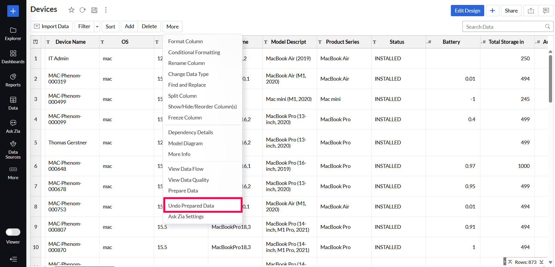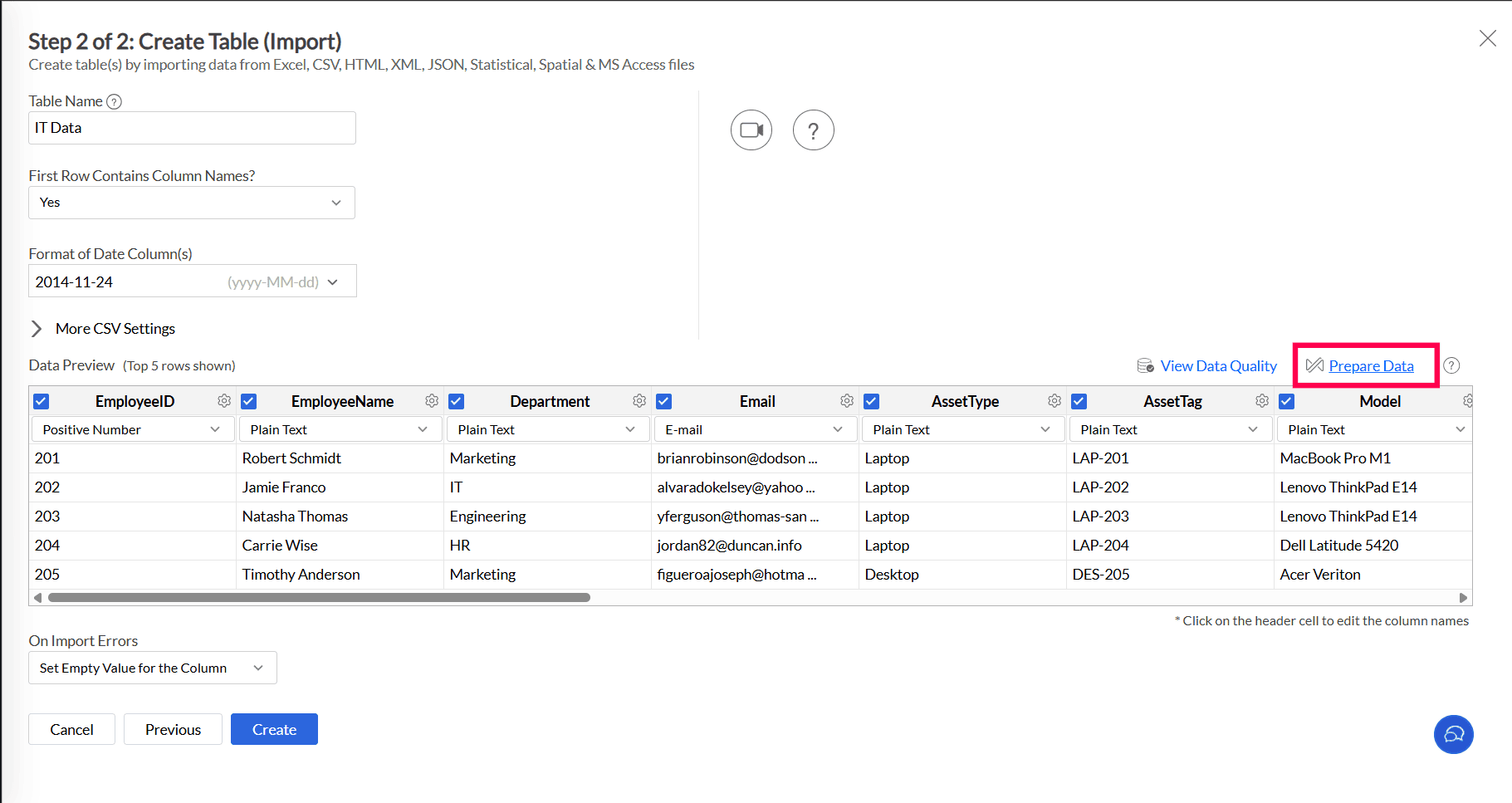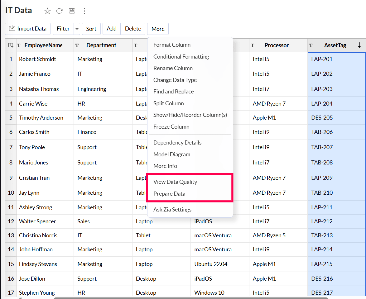 In case, you missed to check the data quality or prepare data while importing, you can always use the options under More, and click on the View Data Quality option to analyze the data quality of your table or use the Prepare Data option to perform data transformations.