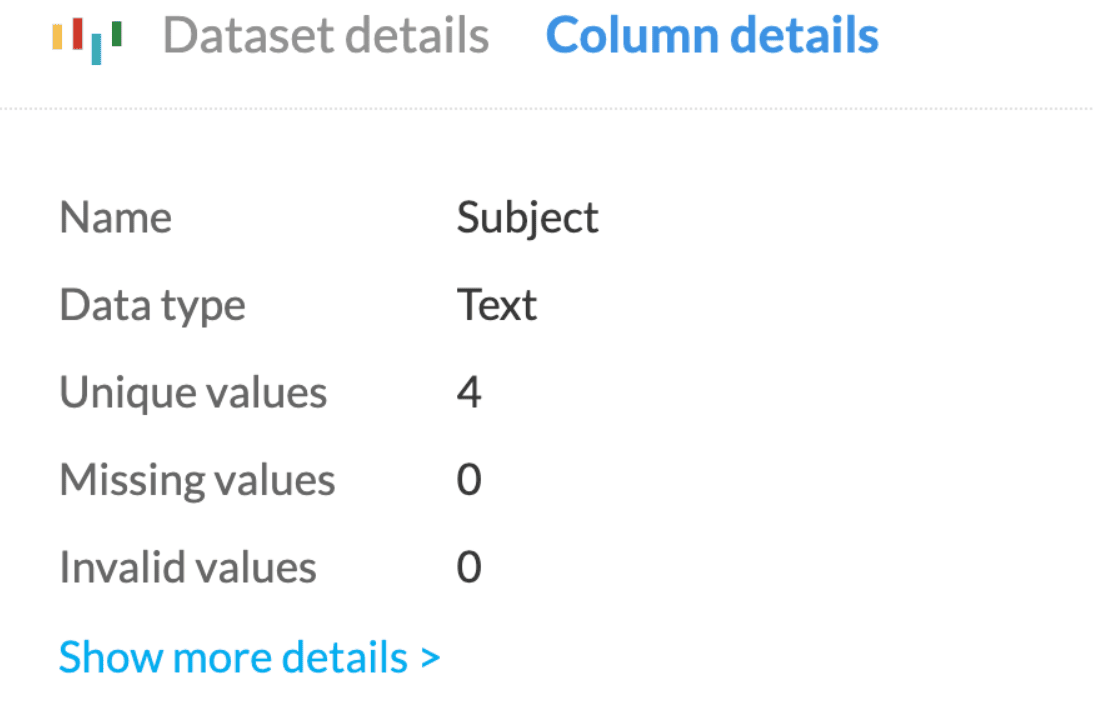 The column details section shows a summary of each column with its data type, the number of unique values in the column, and the number of missing, invalid, and valid entries.