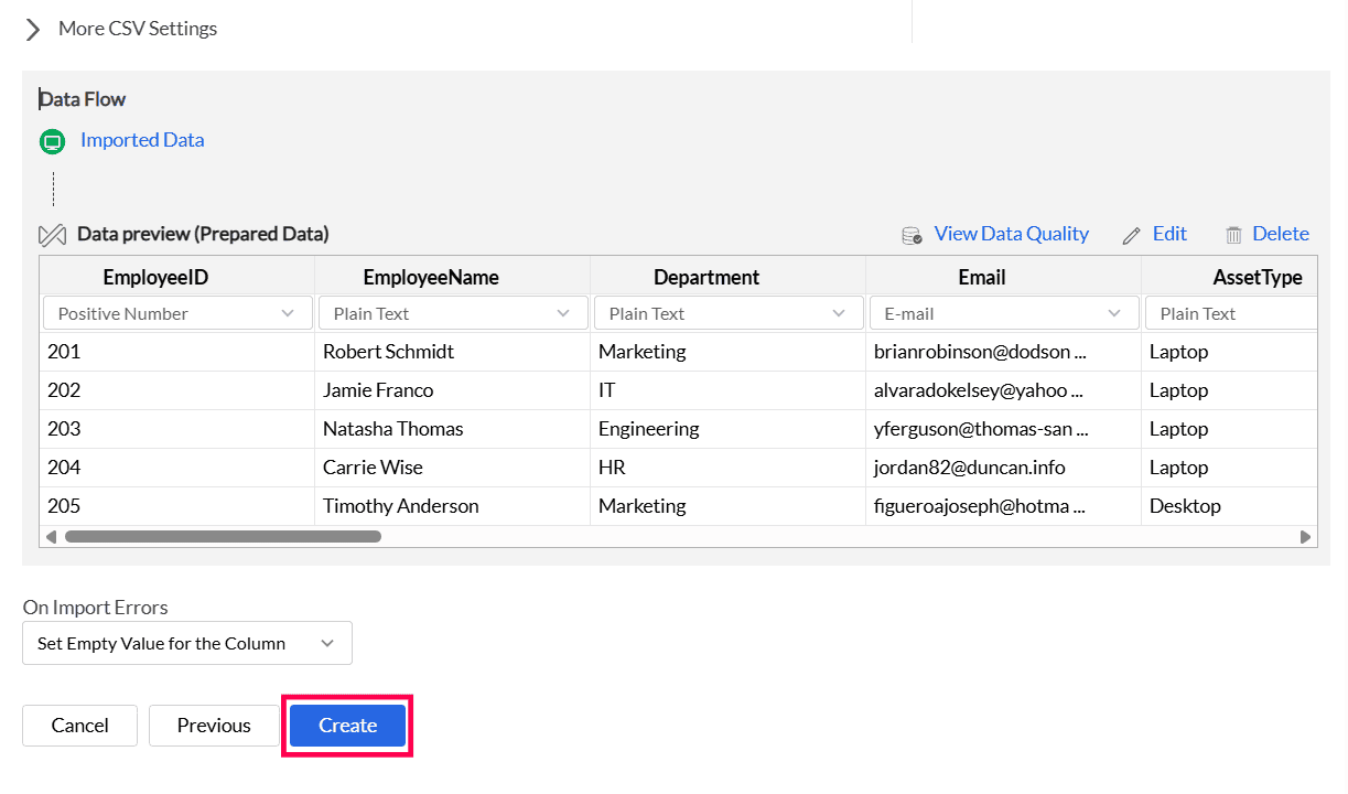 5. The Create Table (Import) pane will open. You can review the Table settings such as Table Name, First Row Contains Column Name and make changes if needed.