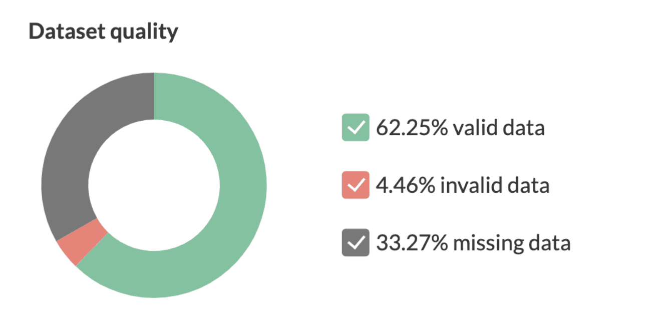 The data quality chart splits data into a percentage of valid data, invalid data, and missing values. Click on the sections of the chart to view valid data selectively, invalid data, and missing values in your dataset. Here's a snapshot of data quality chart.