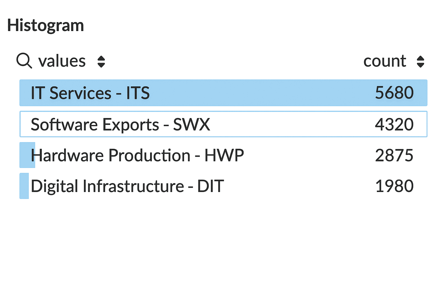 A graphical representation of data distribution and the range of values present in a column is shown at the top of each column as a Histogram. Using the histogram, you can spot outliers and anomalies in the data. You can also select a bar of the histogram to filter the data within a specific range.